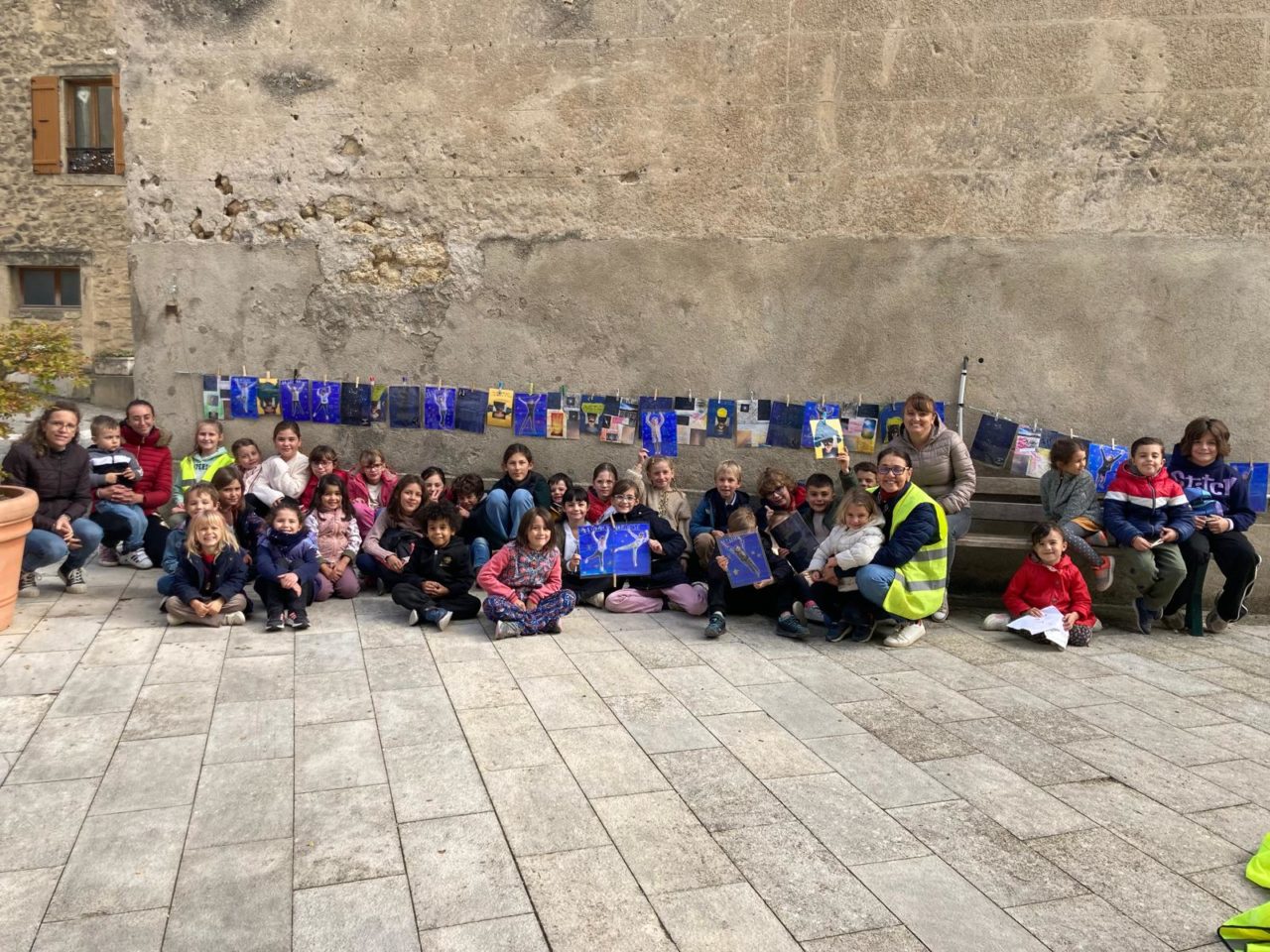 Et surtout en demandant à m. Le Maire l’autorisation d’exposer et de » sortir nos œuvres » dans le village , celui-ci ayant donné son accord, nous avons profité du temps de la récréation pour aller accrocher celles-ci , avec nos pinces à linge : sur les filins de la mairie, devant la maison de Camille Isaure Emma et Apolline, sur les grilles près du panneau CRA place du Cgzmps de Mars , avec l’accord demandé a la secrétaire de mairie, faute de place près de la mairie de Grâne.