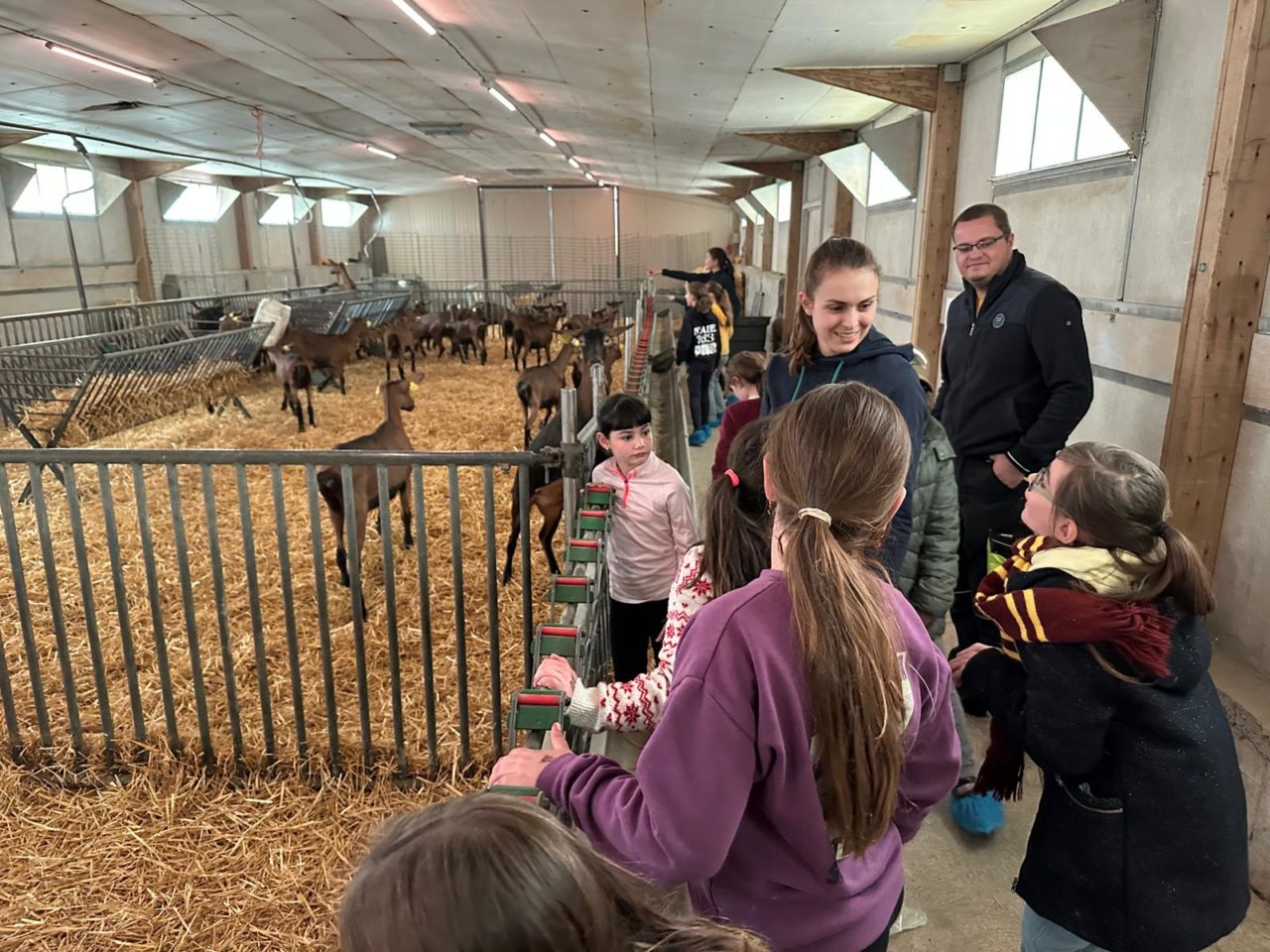 – la visite de la chèvrerie en 3 groupes en prenant en compte l âge des enfants répartis par classe… trop cool de comparer toutes ces belles chèvres…blanches et marrons….